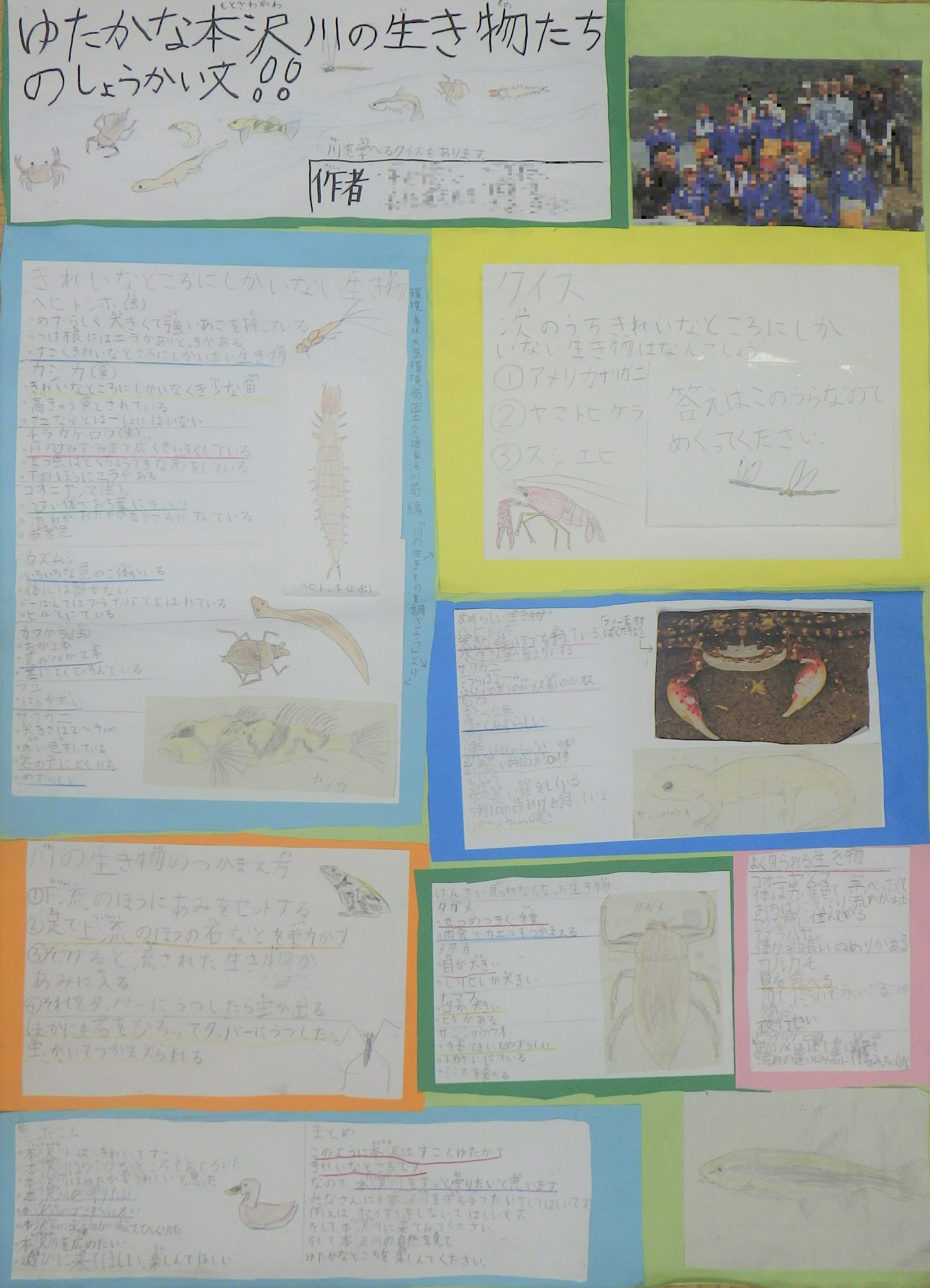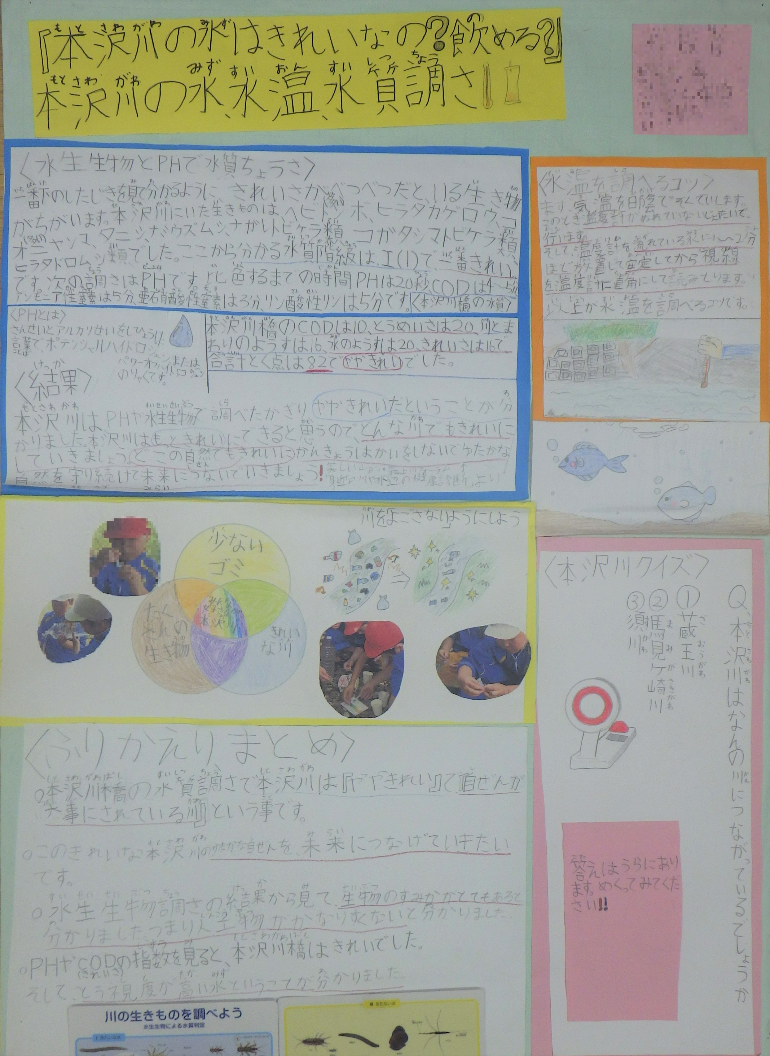 ![]() ①R7年度の総合学習 ②本沢川の生き物 ↳本沢川の魚調べ(※個人の自由研究より) ③本沢川の水温・水質 ↳水生生物による水質判定資料(※水生生物の画像あり) ④水とゴミのゆくえ